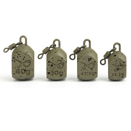 Ciężarki z krętlikiem o bardzo płynnej pracy, spłaszczone po bokach, aby wyeliminować obracanie się na dnie. Wydłużony, kwadratowy przekrój dla poprawy dokładności rzutu. Pokryte powłoką kamuflująca w plamki.