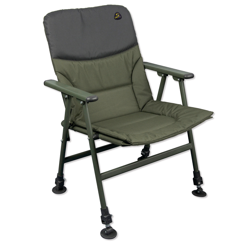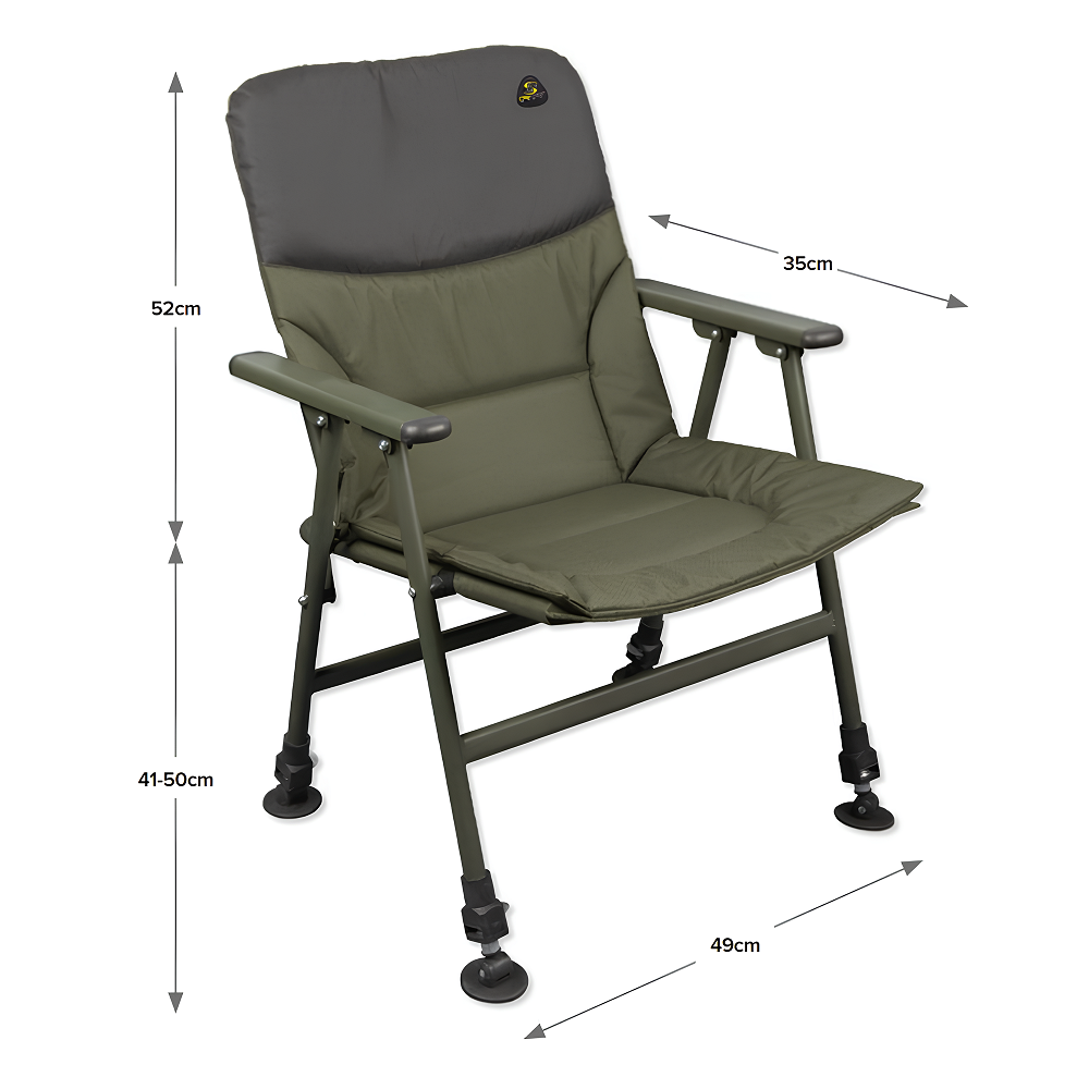 Fotel Carp Spirit z podłokietnikami to klasyczny i wygodny model, idealny zarówno na dłuższe zasiadki karpiowe czy feederowe, jak i krótsze wypady na ryby. Wyposażony w cztery teleskopowe nogi z dużymi stopkami, doskonale sprawdza się na nierównym czy miękkim podłożu, zapewniając stabilność w każdych warunkach terenowych.