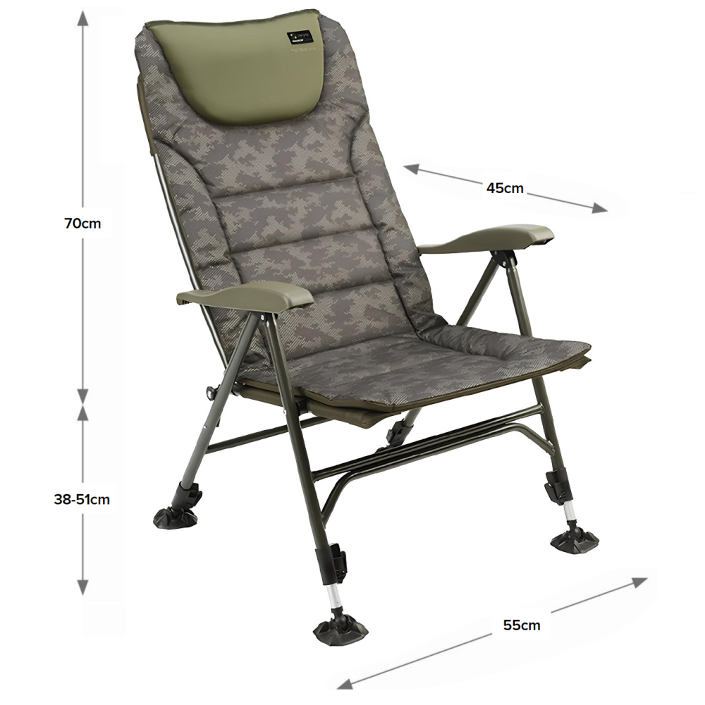 Ten nowy na 2025 fotel został zaprojektowany z myślą o najbardziej wymagających wędkarzach. Ten model typu Hi-Back, oferuje wyjątkowy komfort, doskonałe podparcie lędźwiowe oraz pełną regulację pozycji oparcia i wysokości nóg, dzięki czemu idealnie sprawdza się w każdych warunkach terenowych – nawet na bardzo nierównym brzegu.