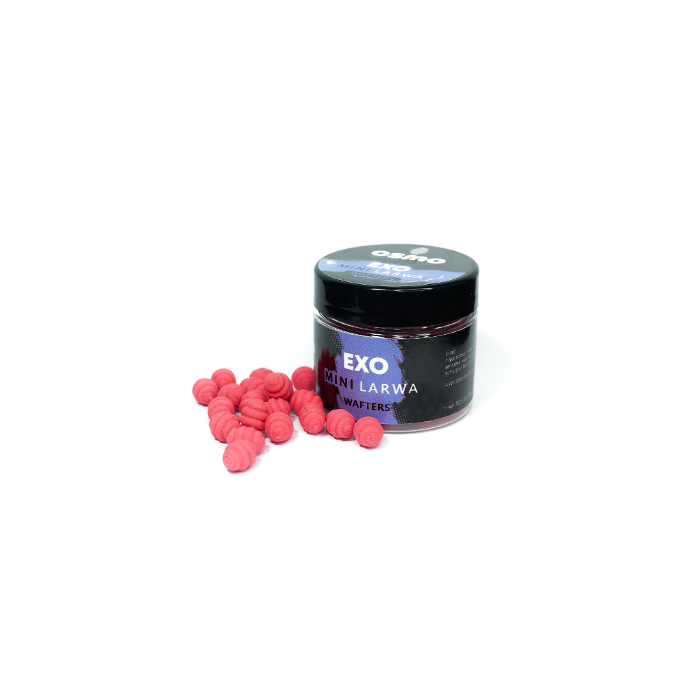 Exo to 7mm przynęta w kształcie larwy o mocnym aromacie słodkich ciemnych deserowych winogron. W 50ml pudełku znajdziecie RÓŻOWE waftersy, co w połączeniu z kształtem oraz aromatycznym zapachem daje wspaniałe efekty nad wodą. Jak wszystkie mają sporą wyporność jak na waftersy, haki które je balansują (ważne: balansujemy larwy hakami nie bagnetami) to rozmiary 8, 10, 12. Przynęta uniwersalna i łowna przez cały sezon.