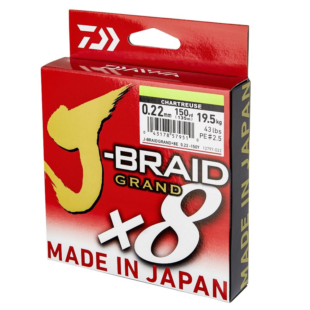 W porównaniu z dotychczasową J-Braid X8 udoskonalona Grand X8 cechuje się ciaśniejszym splotem, który skutkuje wyższą wytrzymałością na węźle i większą odpornością na ścieranie. Dzięki specjalnej procedurze polegającej na odpowiednim naciąganiu J-Braid Grand X8 w trakcie procesu produkcji dodatkowo zwiększa się jej udźwig i poprawia ścieralność. J-Braid Grand X8 jest bardzo miękka, a dzięki powlekanej powierzchni również ekstremalnie cicho przesuwa się przez przelotki. Jest nieco sztywniejsza od J-Braid X8 przez co lepiej nadaje się do połowu w wietrzne dni, kiedy zarzucanie jest mocno utrudnione. Plecionka wykonana w Japonii.
