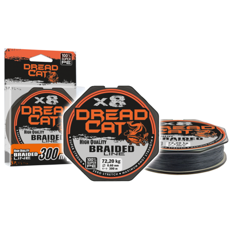 Plecionka przygotowana specjalnie do połowu sumów zarówno na przynęty sztuczne jak i przy wykorzystaniu nowoczesnych metod gruntowych. Dzięki zastosowaniu supermocnego, 8 splotowego polietylenu linka ta odznacza się wysoką wytrzymałością na przetarcia i niską nasiąkliwością. Przy jej produkcji została zastosowana technologia zapewniająca trwałość koloru i gładkość powierzchni, która jest szczególnie potrzebna do osiągania dalekich rzutów. Zastosowanie Dread Cat X8 pozwala na wyposażenie dowolnego zestawu w plecionkę o najwyższych parametrach niezbędnych w każdym zestawie poddawanym ekstremalnym warunkom, które bardzo często występują przy łowieniu sumów.