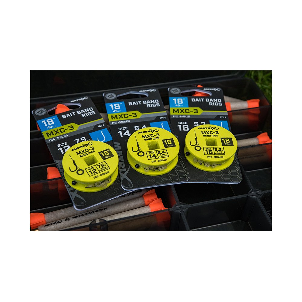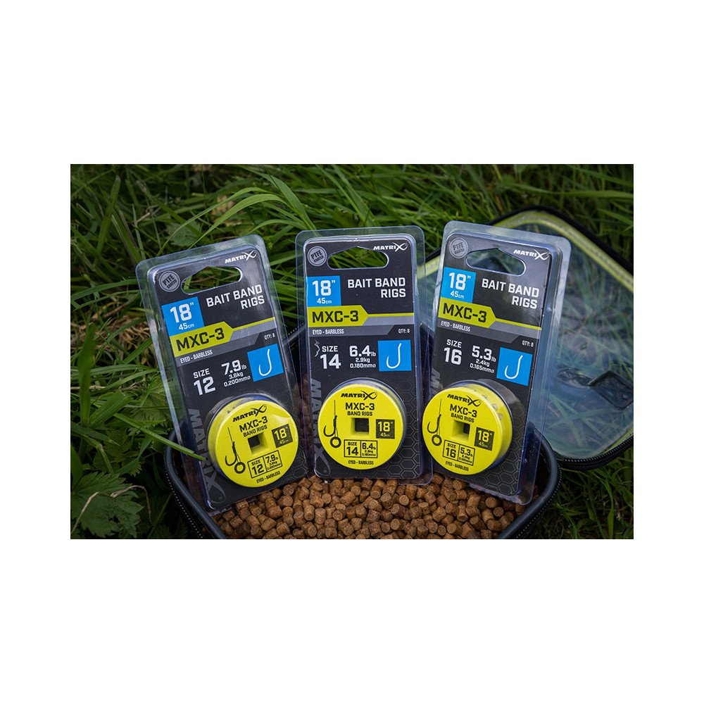 Dłuższe przypony przeznaczone do łowienia z ciężarkiem lub pellet wagglerem, idealne do zakładania na gumkę peletów lub dumbelsów. Pokryte teflonem haczyki MXC-3 mają wygięte na zewnątrz oczko, co poprawia prezentację przyponu włosowego. Dokładna długość 18 cali (45 cm) pozwala na bezpieczne przechowywanie w pudełkach z dyskami na przypony Matrix. Średniej wielkości, bardzo wytrzymałe gumki do peletów Matrix. Wykonane z użyciem żyłki Power Micron.
