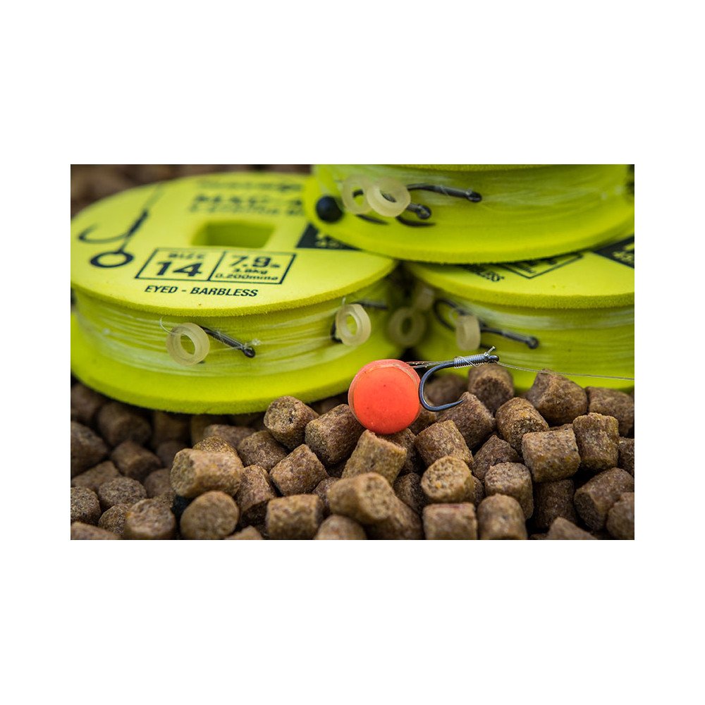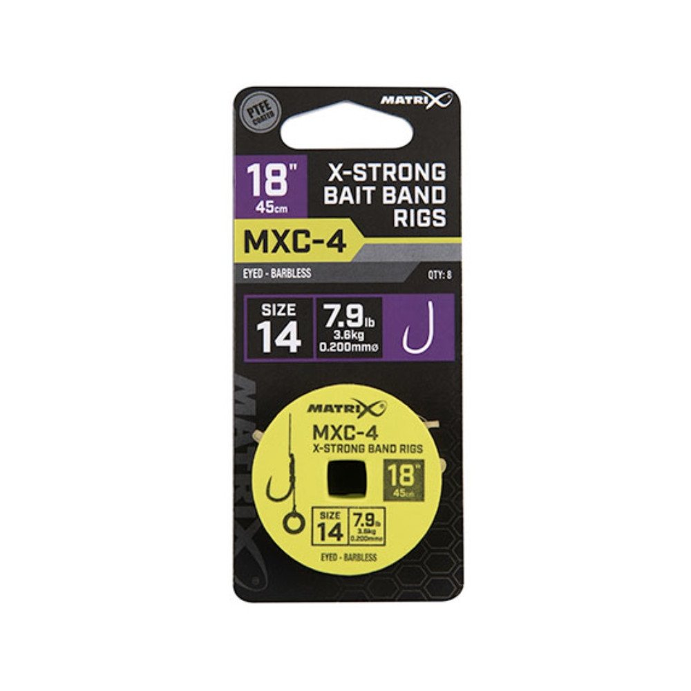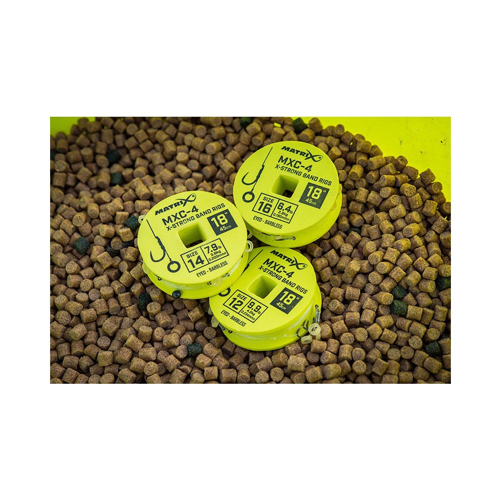 Dłuższe przypony przeznaczone do łowienia z ciężarkiem lub pellet wagglerem, idealne do zakładania peletów lub dumbelsów na gumkę. Bardzo mocne haczyki MXC-4 o szerokim kolanku pokryte teflonem. Opracowane w celu uzyskania maksymalnej wytrzymałości podczas łowienia dużych ryb. Dokładna długość 18 cali (45 cm) pozwala na bezpieczne przechowywanie w pudełkach z dyskami na przypony Matrix. Wytrzymałe gumki Matrix zawiązane metodą Jamiego Hughesa ; metoda gumki w pętli poprawia prezentację i wydłuża żywotność samych gumek. Wykonane z użyciem żyłki Power Micron.