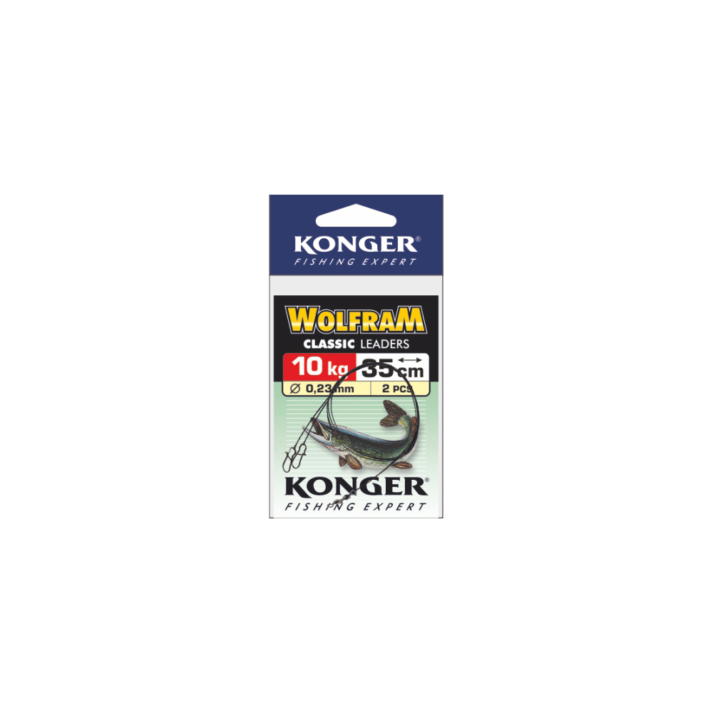 Przypon z wolframu, czyli odporny na zniekształcenia i nie skręcający się. Zabezpiecza nasz zestaw przed ucięciem przez szczupaka. Przypony Kongera wyposażone są w mocne mini agrafki i niezawodne krętliki. Przypony o wytrzymałości 5, 10, 15, 25 i 35 kg do połowu średnich i dużych ryb drapieżnych, uzbrojone są w mocne krętliki najwyższej jakości i wyjątkowo wytrzymałe agrafki z jednolitego drutu.