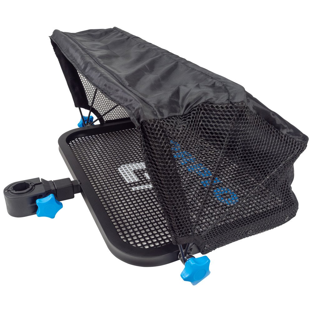 Aluminiowa platforma boczna z osłoną przeciwdeszczową/przeciwsłoneczną, przeznaczona do stanowiska feederowego lub kosza wędkarskiego. Pasuje na nogę 36/30/25 mm.