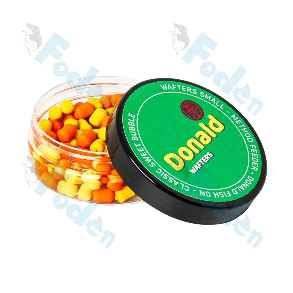 Waftersy w dwóch rozmiarach i zdecydowanie dwa najskuteczniejsze kolory czyli “żywa” pomarańcz i jaskrawa żółć, a do tego słodki zapach przypominający kultową gumę balonową stawiają Donalda wysoko na liście pozycji koniecznych w posiadaniu wędkarza methodowego. Przynęta skuteczna praktycznie o każdej porze roku. Najlepszą prezentację otrzymamy montując waftersy na igle lub bagnecie.